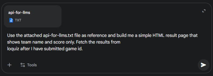 Use the attached api-for-llms.txt file to get instruction on how to fetch Loquiz results data and build me a simple HTML result page that shows team name and score only. Fetch the results from loquiz after I have submitted game id.
