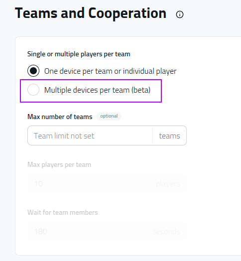 The “multiple devices per team” mode will group devices into teams. Any device answer will update all other team members. As you can imagine, this won’t work in a place without a network connection. So make sure you untick this.