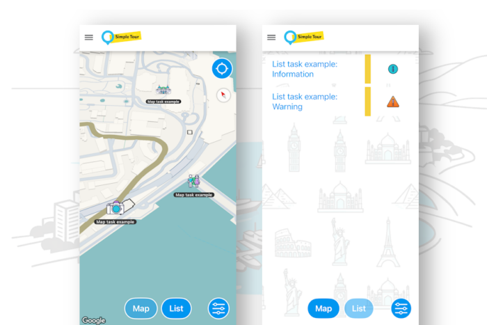 This simple tour tool displays a map and a list. The map includes tasks accessible by GPS. The list shows tasks accessible anytime by the tour user.