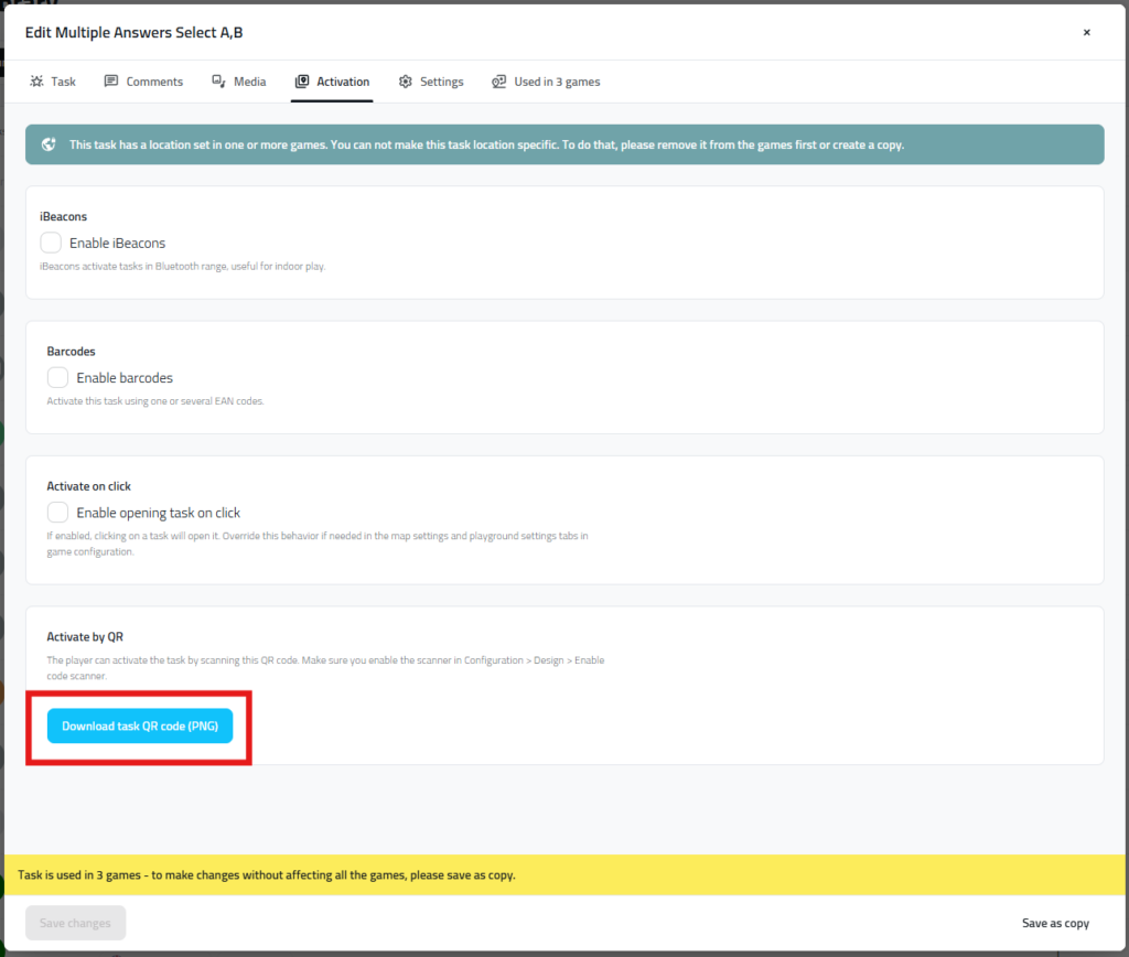 In addition, now you can download an individual QR for only one task. Open already existing task and go to the Activations tab. Clicking on “Download QR for this task” will download a png to your computer. PNG is ideal if you need to insert QR to your own game material designs.