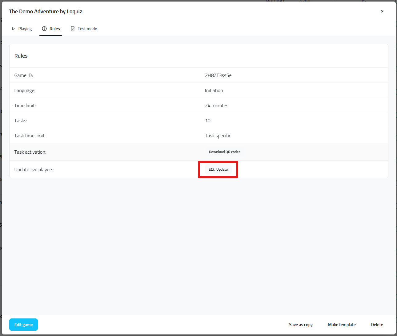 Note! If you change settings during the game, you need to manually update them. Once you have made the changes you wanted in the game, you press SAVE. Now, when you exit the game the pop window will show up with the QR code to scan. If you click on the RULES tab, you’ll see the button “Update”.