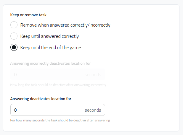 Keeps task until the end of the game allows return to the task and answer it again. If set, you can also decide how long the task will be “inaccessible” for the player after the last answer submitting.
