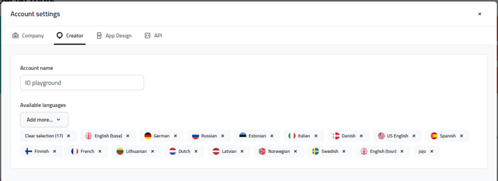 Users can use languages to tag tasks (just for filtering purposes) and to set game language (this affects the app language within the specific game). When the user account is activated then a limited amount of languages are activated (English, German, Russian and Estonian), this is to make it easier to use the language. If the language you need is not visible in dropdown lists when editing game and task, then you need to go to: