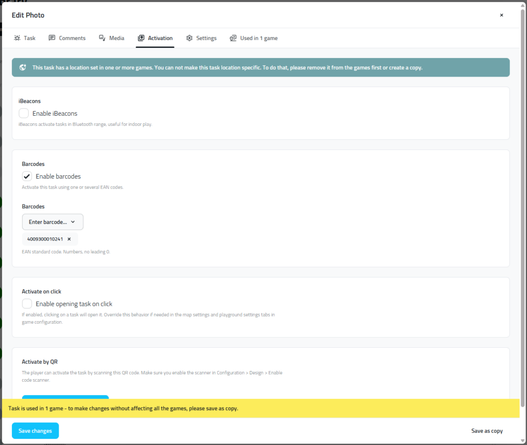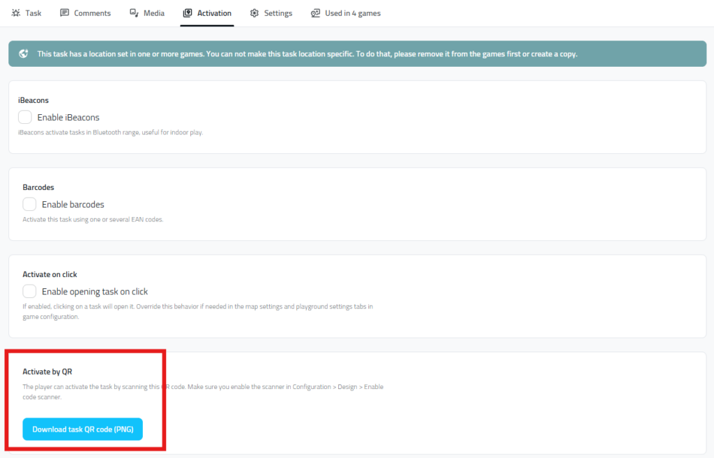 In addition, now you can download an individual QR for only one task. Open already existing task and go to the Activations tab. Clicking on “Download QR for this task” will download a png to your computer. PNG is ideal if you need to insert QR to your own game material designs.