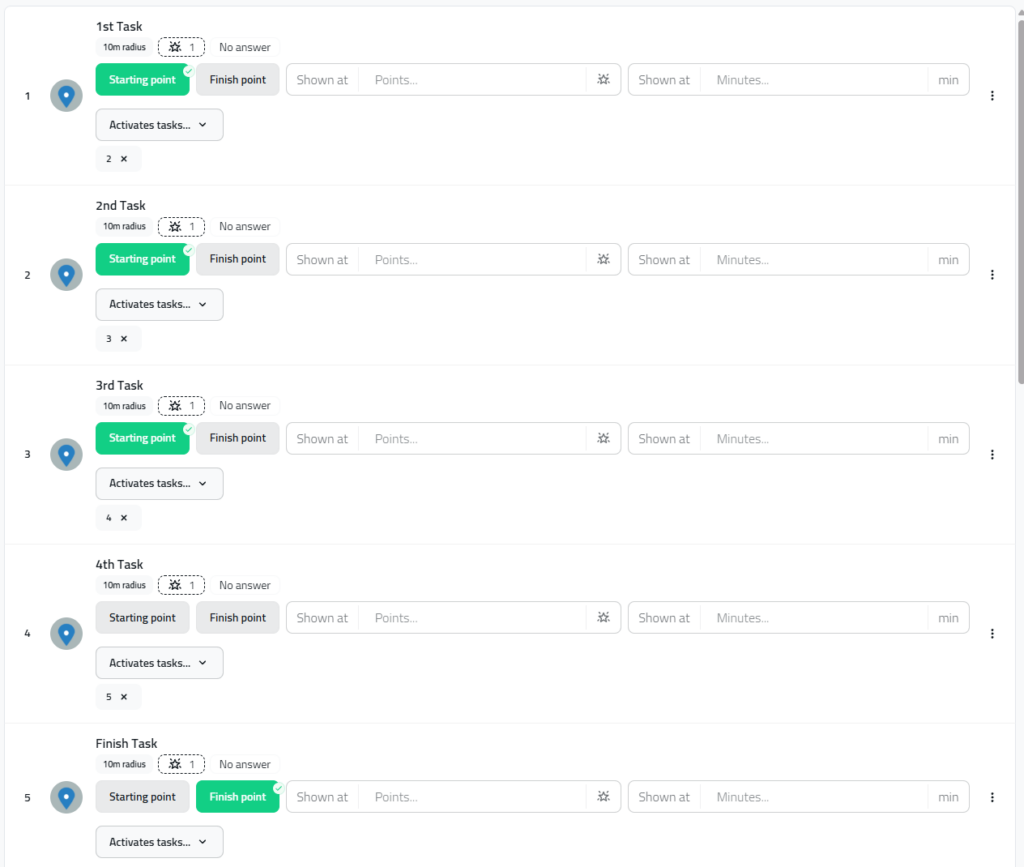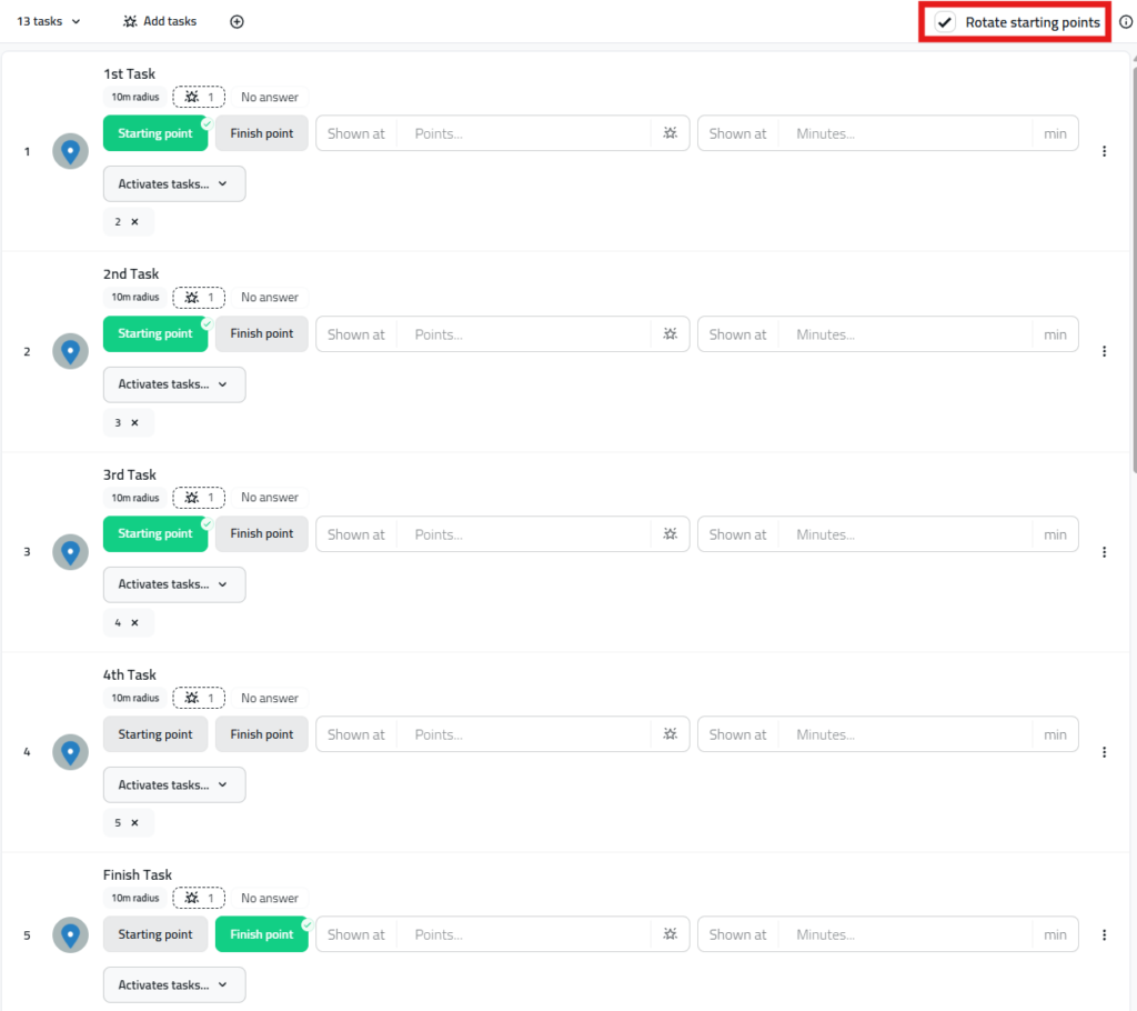 Add the tasks you want to use in the game. If you want you can add one special finish location, but you can also use any task instead of separate finish point.