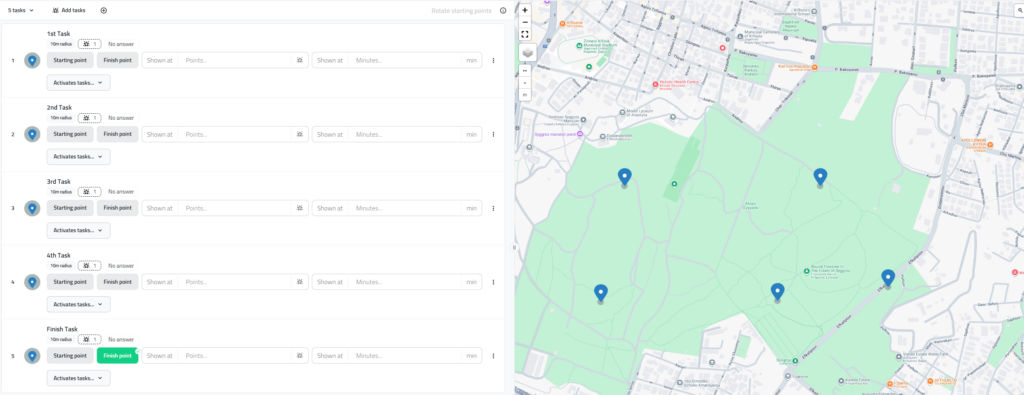 If you did everything correctly, then each team will see different starting point from your marked list of starting points (in our example 1st team to start will see 1st, 2nd number 2, 3rd number 1 in etc.) and after visiting the first task all the other tasks’ pins will appear on the map (also the starting points of other teams), but then teams are in different places physically already.