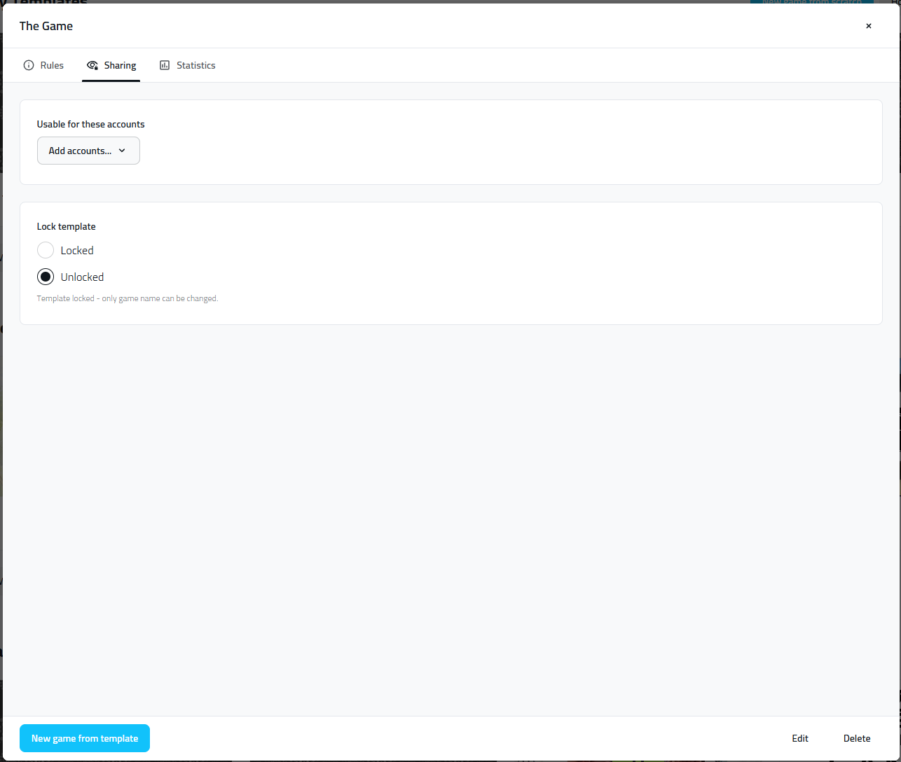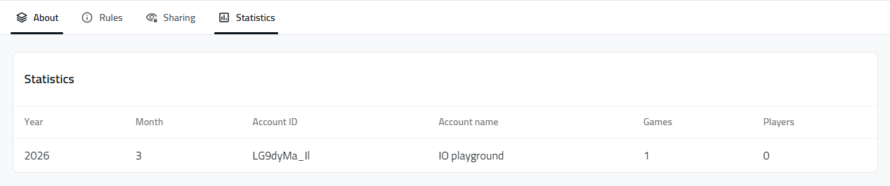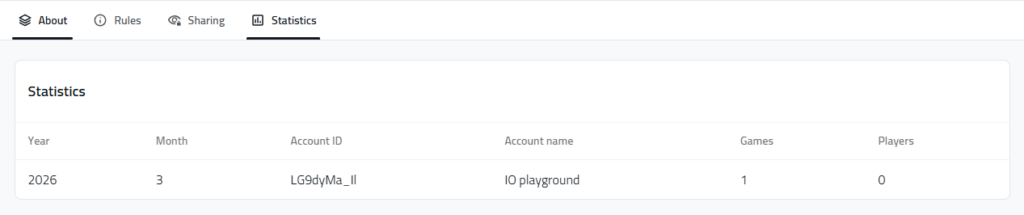 The owner of a Template will have some information available to him about the usage of his shared Template(s). Will be able to see the month and year that his Template was used, the Account name and ID that created a game with his template, how many games he created and how many players participated.