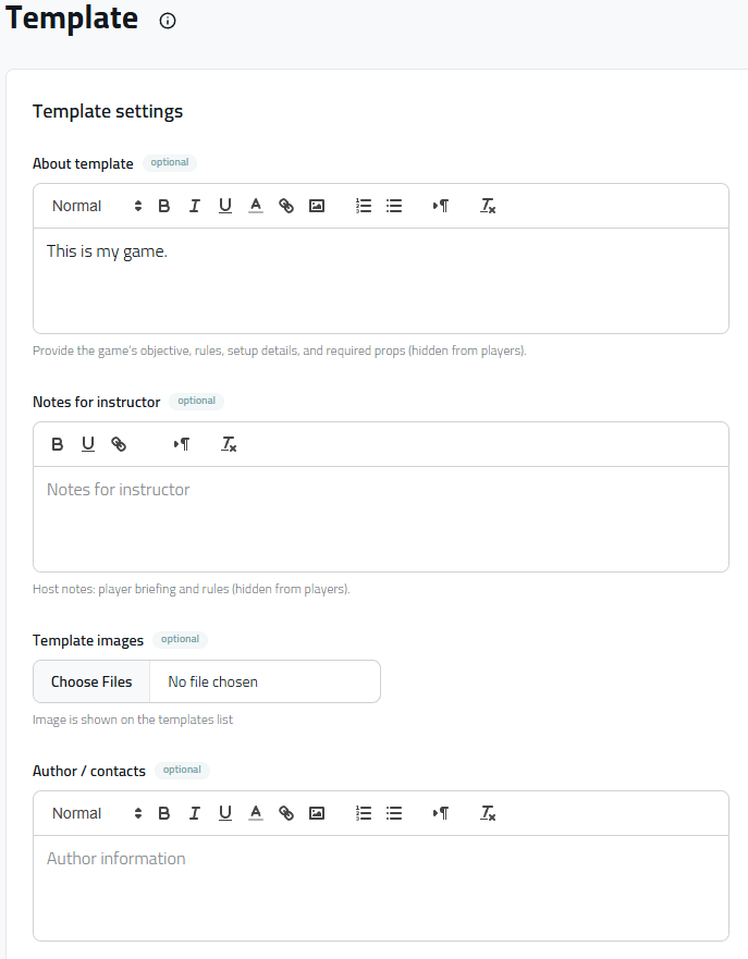 Before sharing your Template, you can add some information to be shown to the other Loquiz account owner (game duration, plot of the game, etc.). Otherwise it will be shown empty.